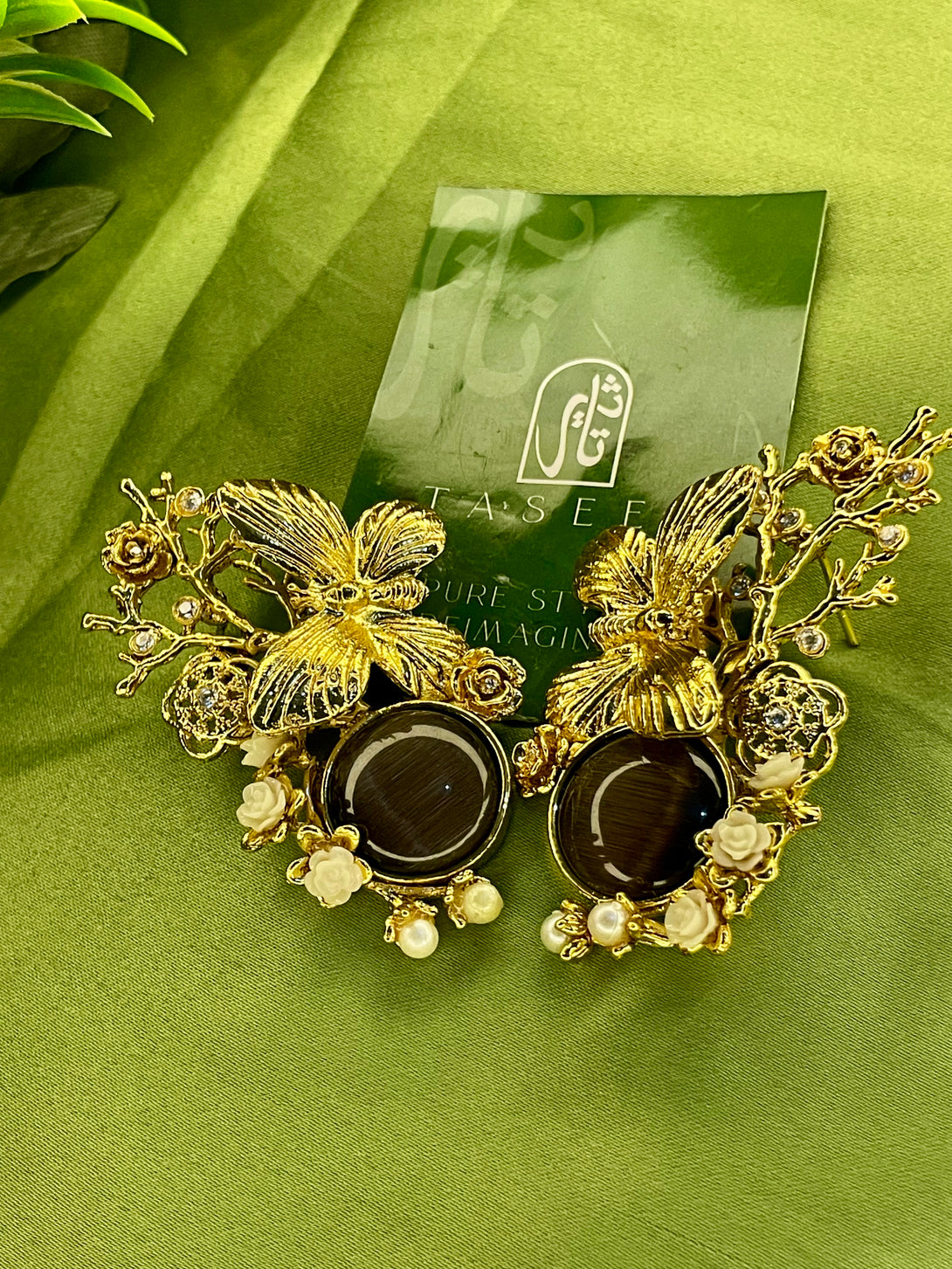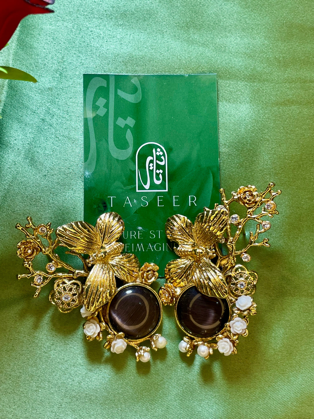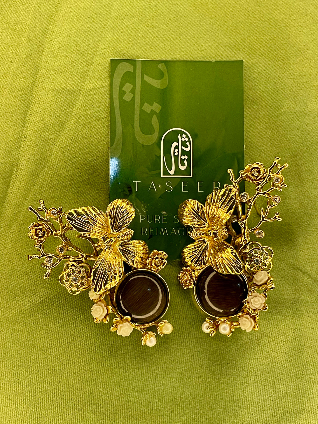 Add a touch of elegance to your collection with these Butterfly Sparkle Stud Earrings from Taseer. Designed to capture the essence of nature, each earring features a delicate butterfly motif adorned with sparkling accents and intricate floral details. The rich brown tones bring warmth and sophistication, making these studs a perfect choice for both casual outings and special occasions.