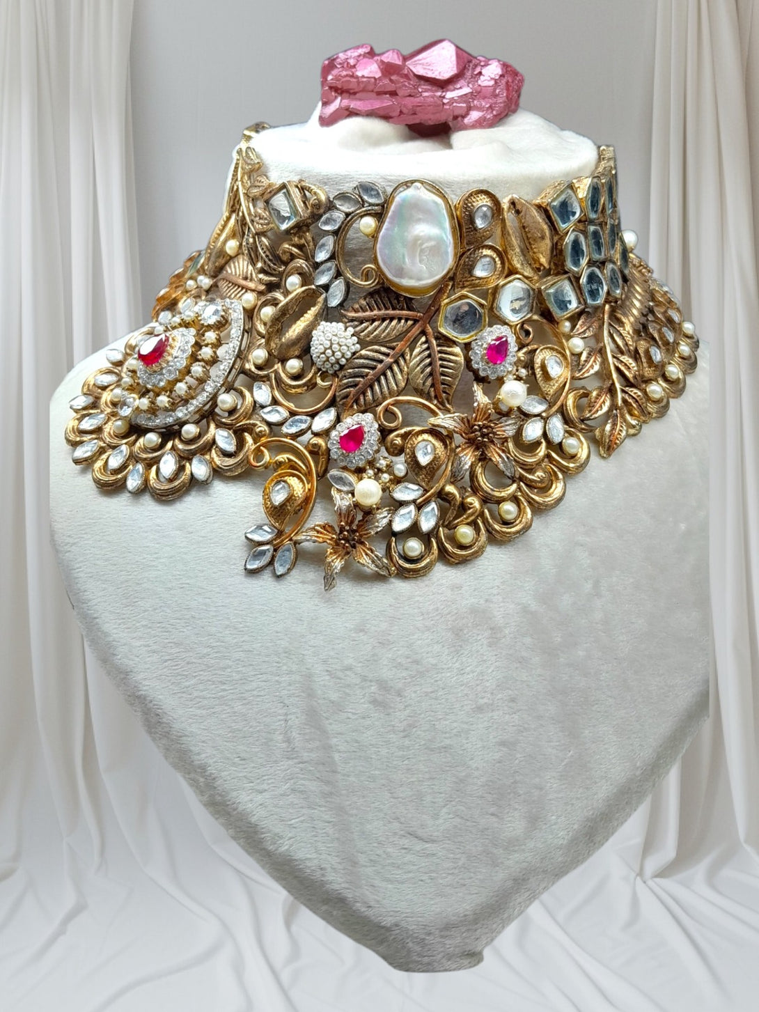 - **Intricate Design**: The choker-style necklace is adorned with a blend of **pearls, rubies**, and precious stones, designed to reflect a timeless royal charm. The perfect balance of textures and colors creates a breathtaking visual.