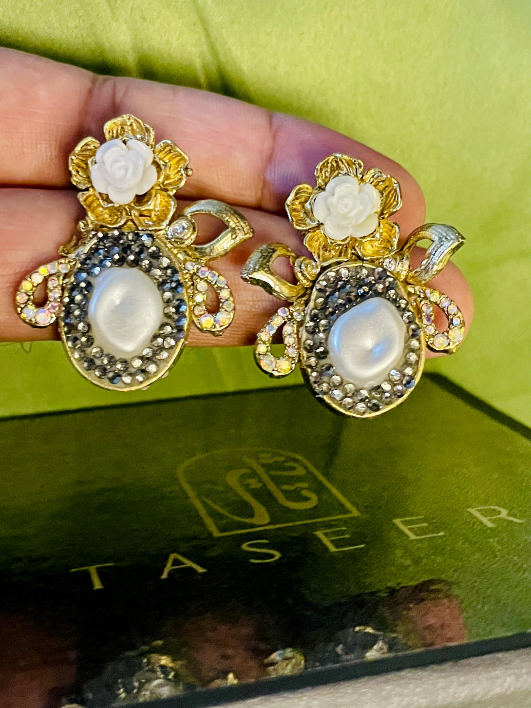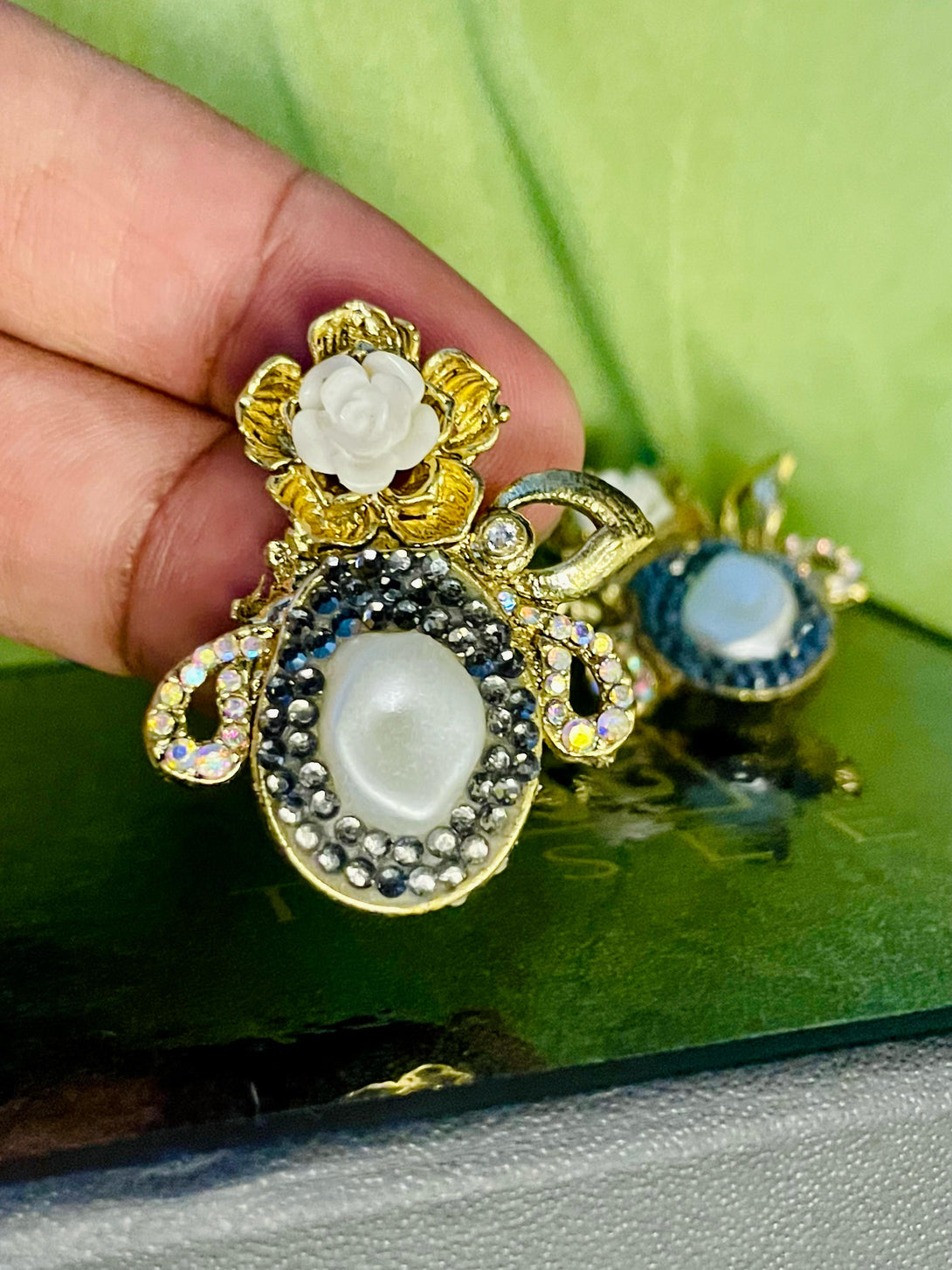 Elevate your elegance with the Handcrafted Earrings - Turkish Stones Oval Floral Studs by Taseer. These striking earrings feature a mesmerizing oval Turkish stone as the centerpiece, surrounded by delicate floral motifs, shimmering pearls, and artistic embellishments. The intricate design blends vintage charm with a modern aesthetic, making these studs a standout addition to any jewelry collection. Perfect for evening soirées, festive occasions, or simply adding a touch of glamour to your everyday look.