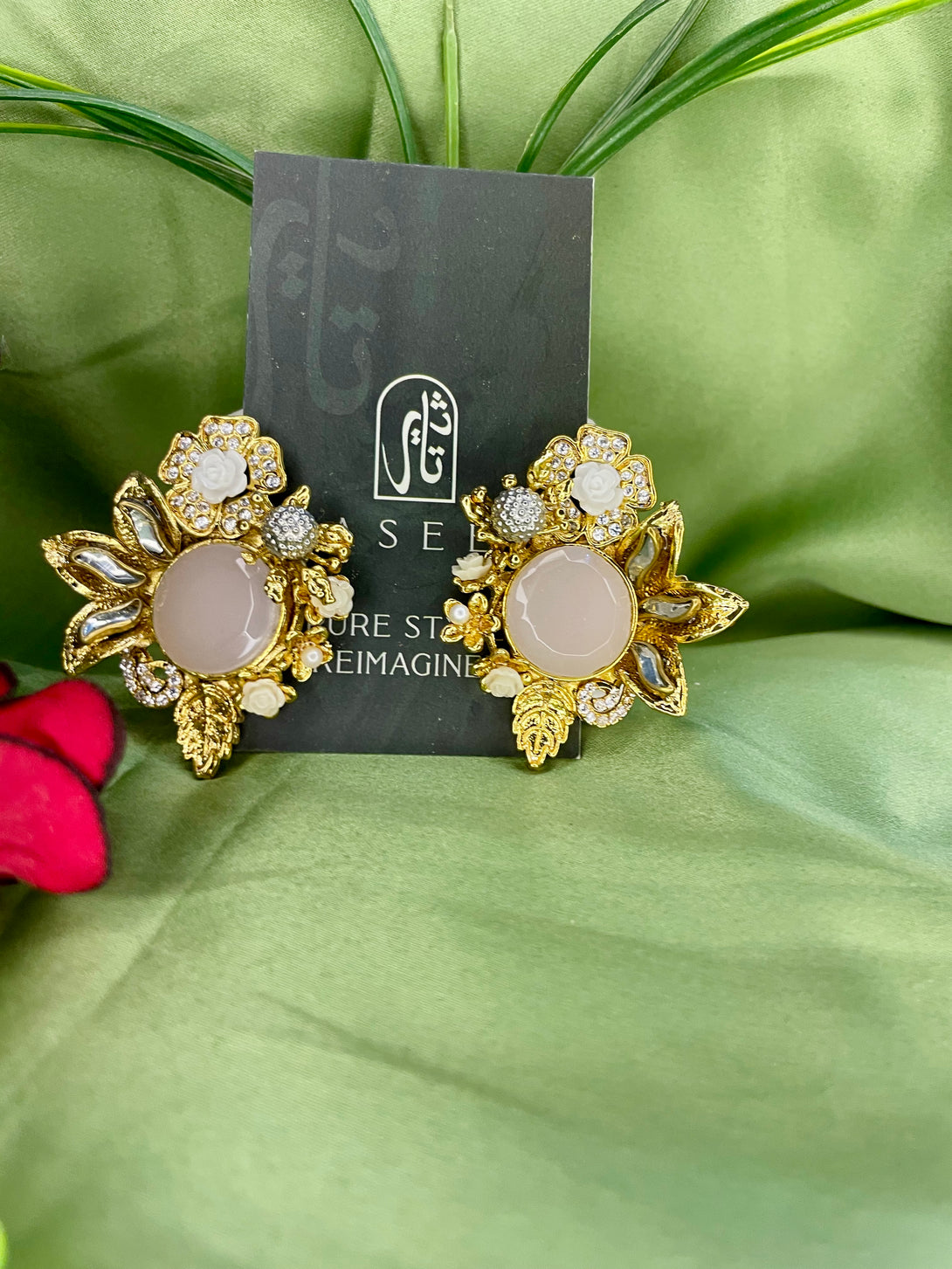 Earrings - Designer Semi Precious Stones Studs - Pink