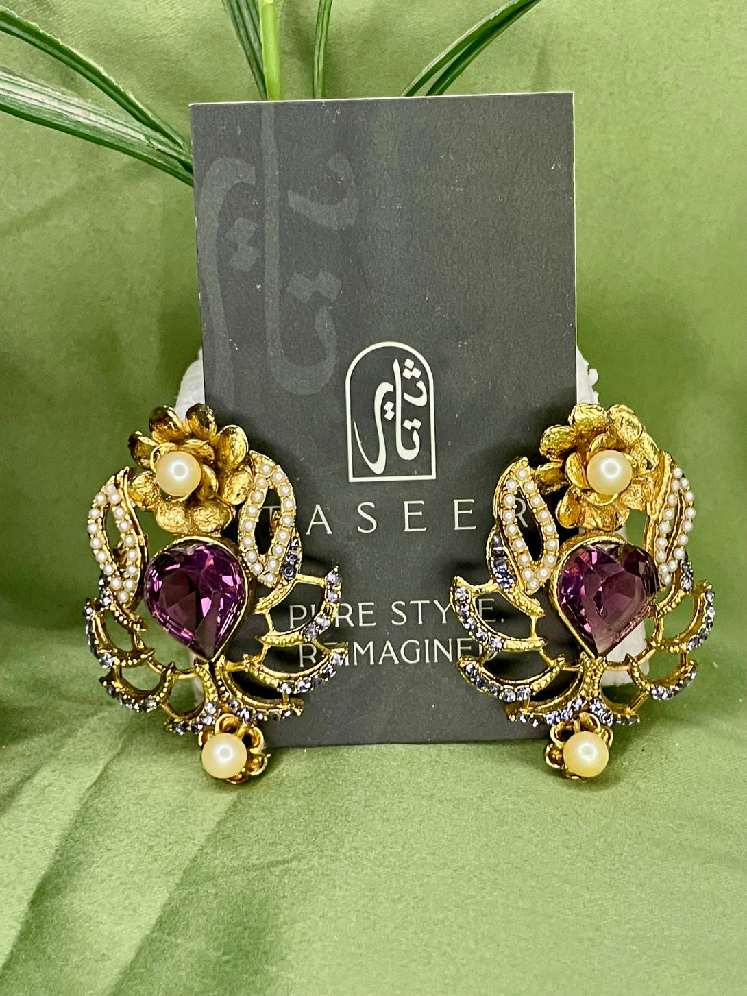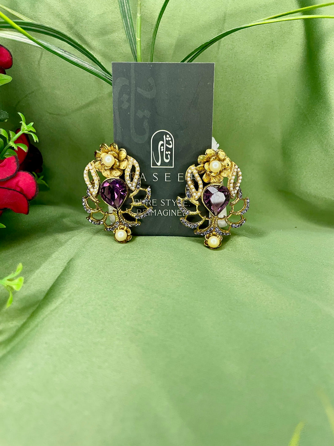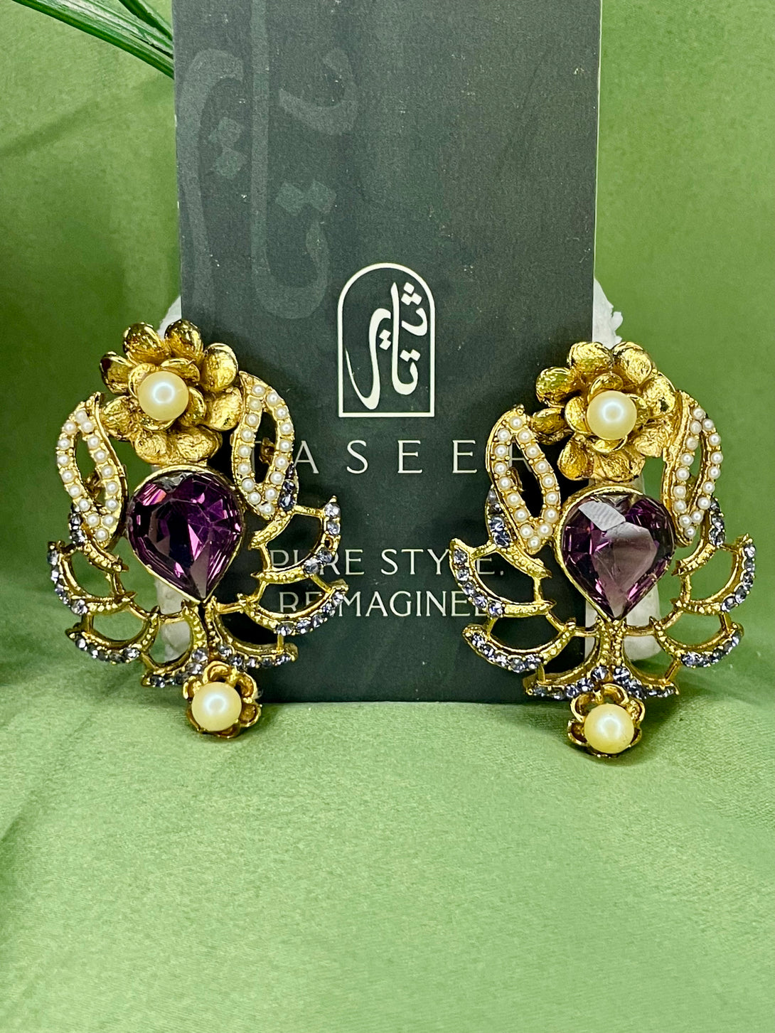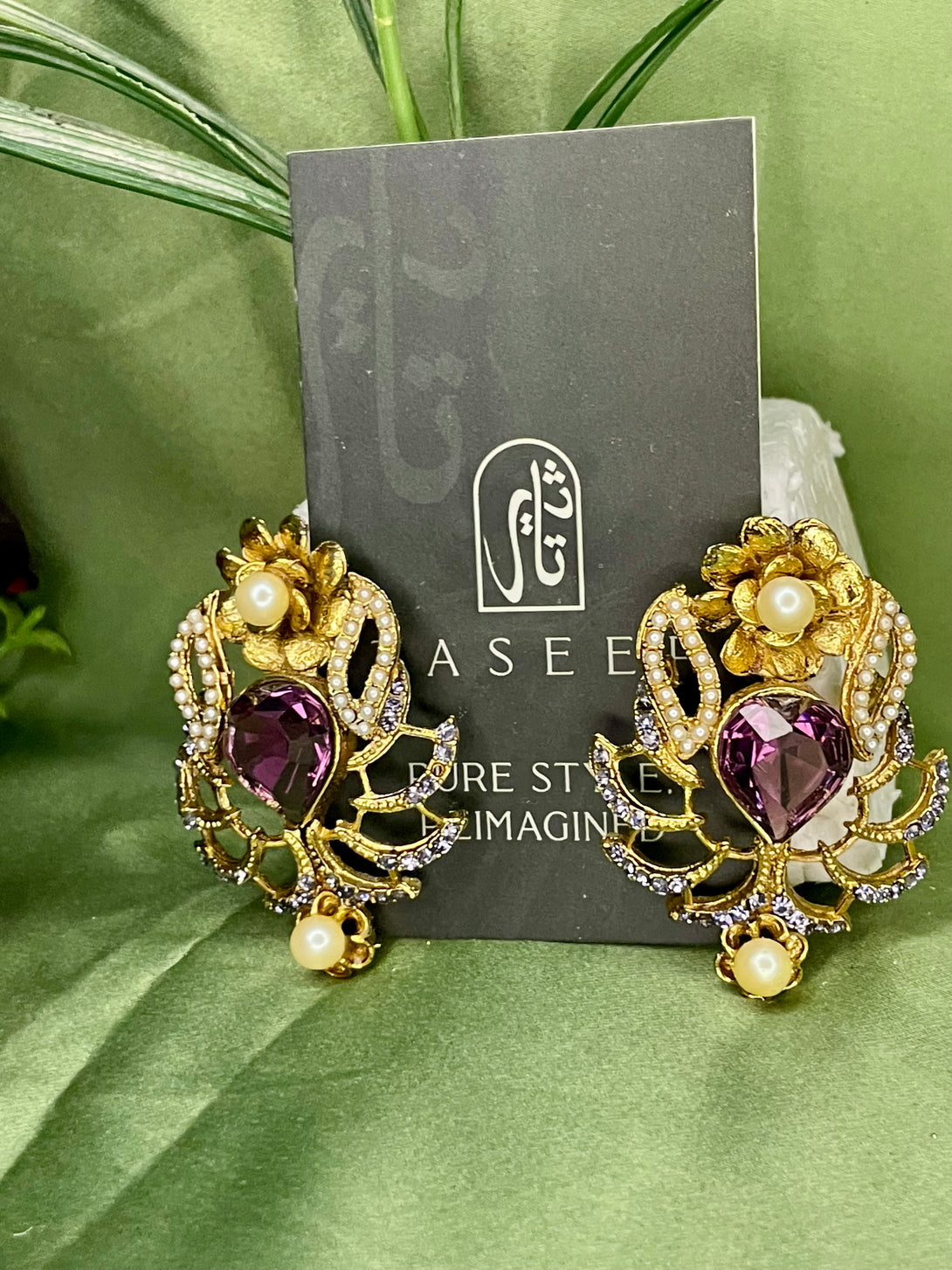 Add a touch of elegance and mystique to your style with the Dreamy Stud Earrings in Purple by Taseer. These exquisite earrings feature rich purple stones set in a beautifully crafted floral design, adorned with delicate pearls and intricate detailing. Perfect for special occasions or to elevate your everyday look, these studs embody sophistication and grace, making them an essential addition to any jewellery collection.