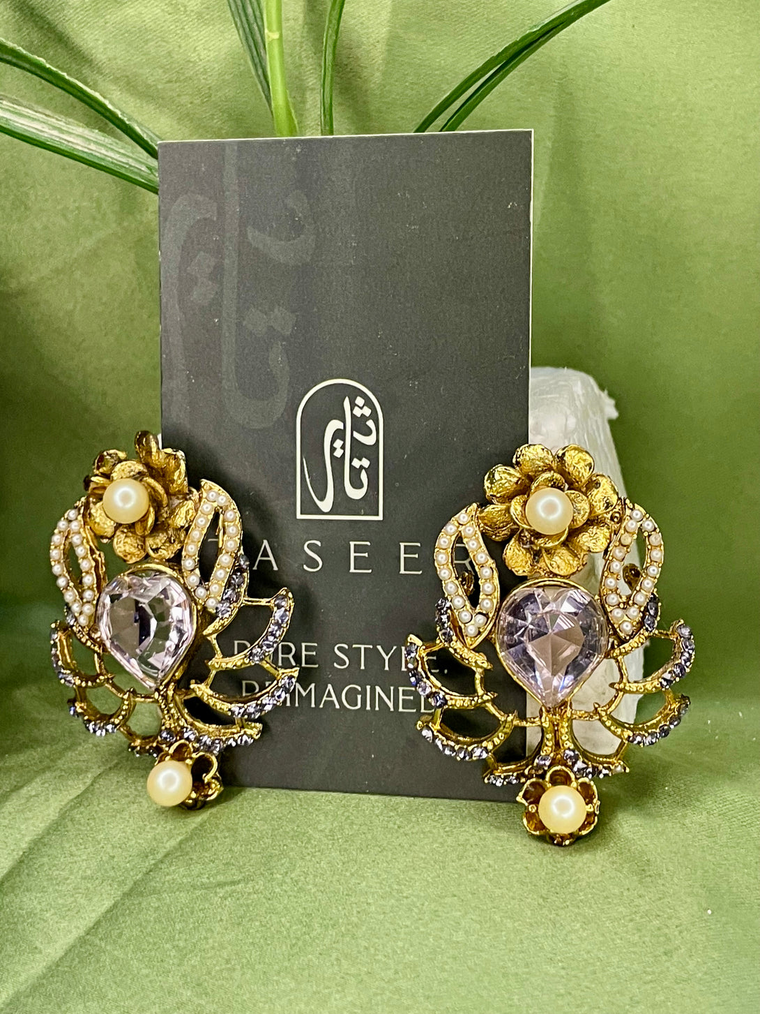 Add a touch of elegance and mystique to your style with the Dreamy Stud Earrings in Silver by Taseer. These exquisite earrings feature rich purple stones set in a beautifully crafted floral design, adorned with delicate pearls and intricate detailing. Perfect for special occasions or to elevate your everyday look, these studs embody sophistication and grace, making them an essential addition to any jewelry collection.