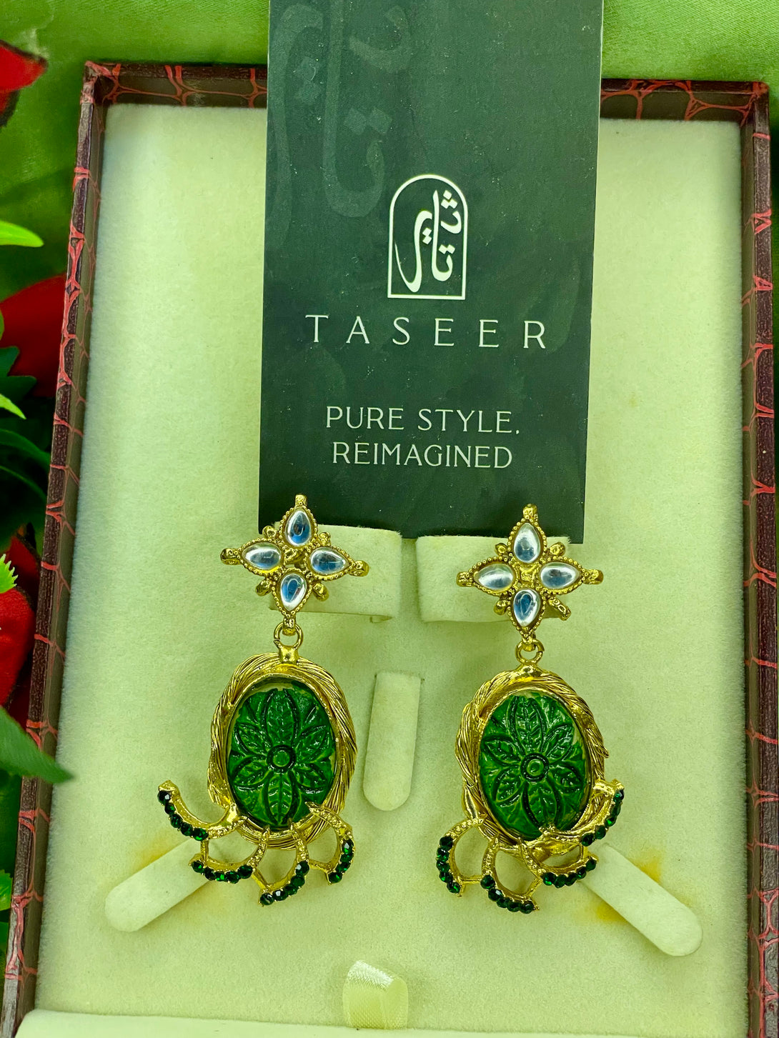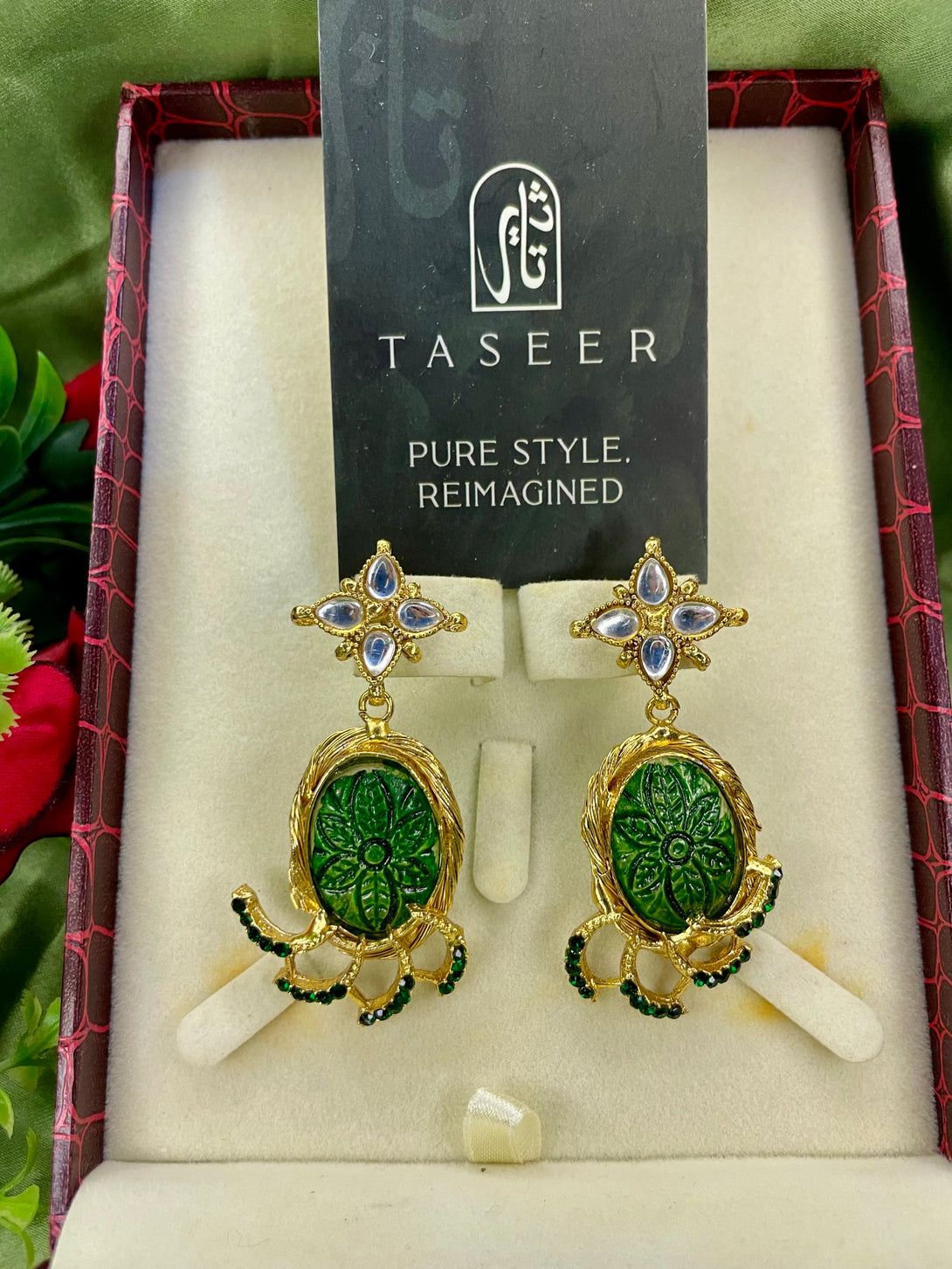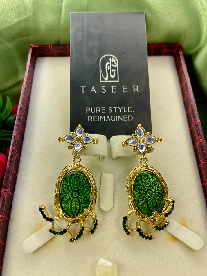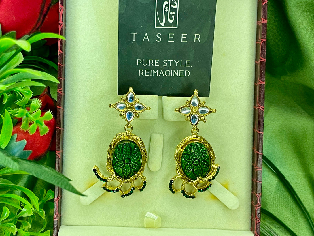 Make a bold statement with the Dynasty Earrings in Dark Green by Taseer. These stunning handcrafted earrings feature dramatic, large green stones intricately carved to capture and reflect light, enhancing their captivating beauty. The artistic carvings and rich dark green hue make these earrings a unique accessory that brings elegance and charm to any outfit. Perfect for formal events or elevating your everyday style, the Dynasty Earrings are designed to leave a lasting impression.