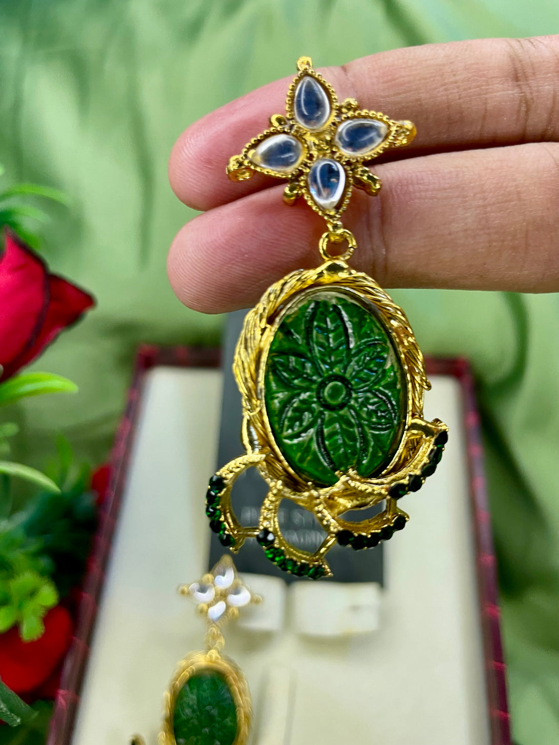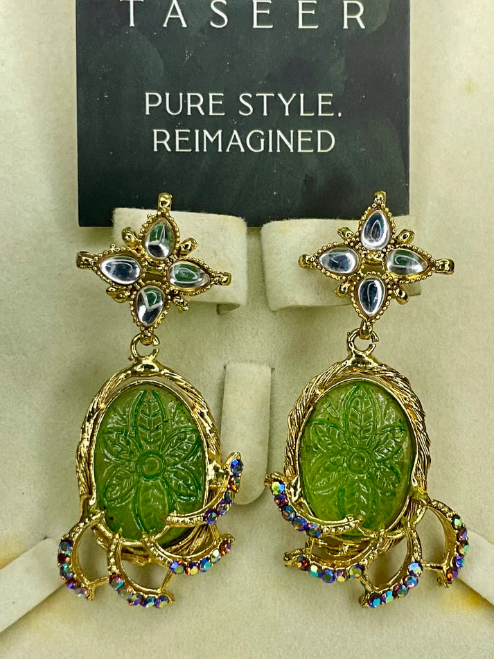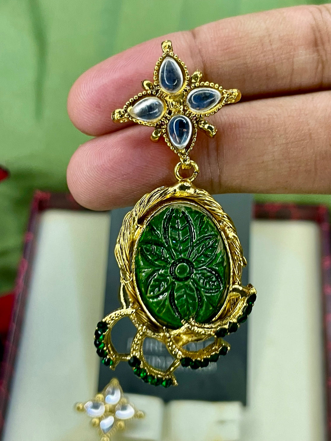 Make a bold statement with the Dynasty Earrings in Dark Green by Taseer. These stunning handcrafted earrings feature dramatic, large green stones intricately carved to capture and reflect light, enhancing their captivating beauty. The artistic carvings and rich dark green hue make these earrings a unique accessory that brings elegance and charm to any outfit. Perfect for formal events or elevating your everyday style, the Dynasty Earrings are designed to leave a lasting impression.