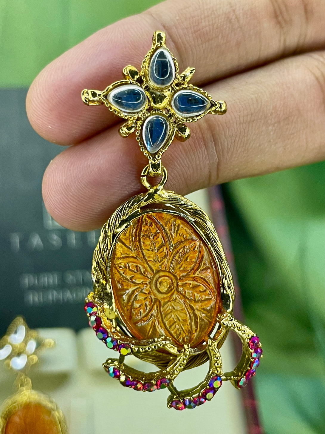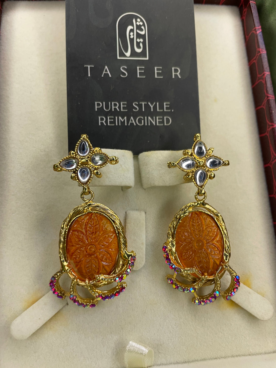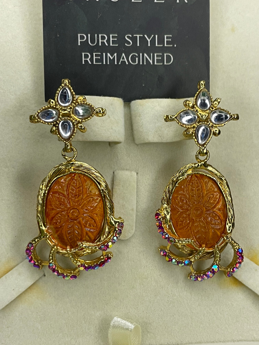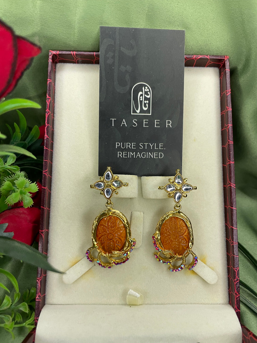 Make a bold statement with the Dynasty Earrings in Rusty Orange by Taseer. These stunning handcrafted earrings feature dramatic, large green stones intricately carved to capture and reflect light, enhancing their captivating beauty. The artistic carvings and rusty orange hue make these earrings a unique accessory that brings elegance and charm to any outfit. Perfect for formal events or elevating your everyday style, the Dynasty Earrings are designed to leave a lasting impression.