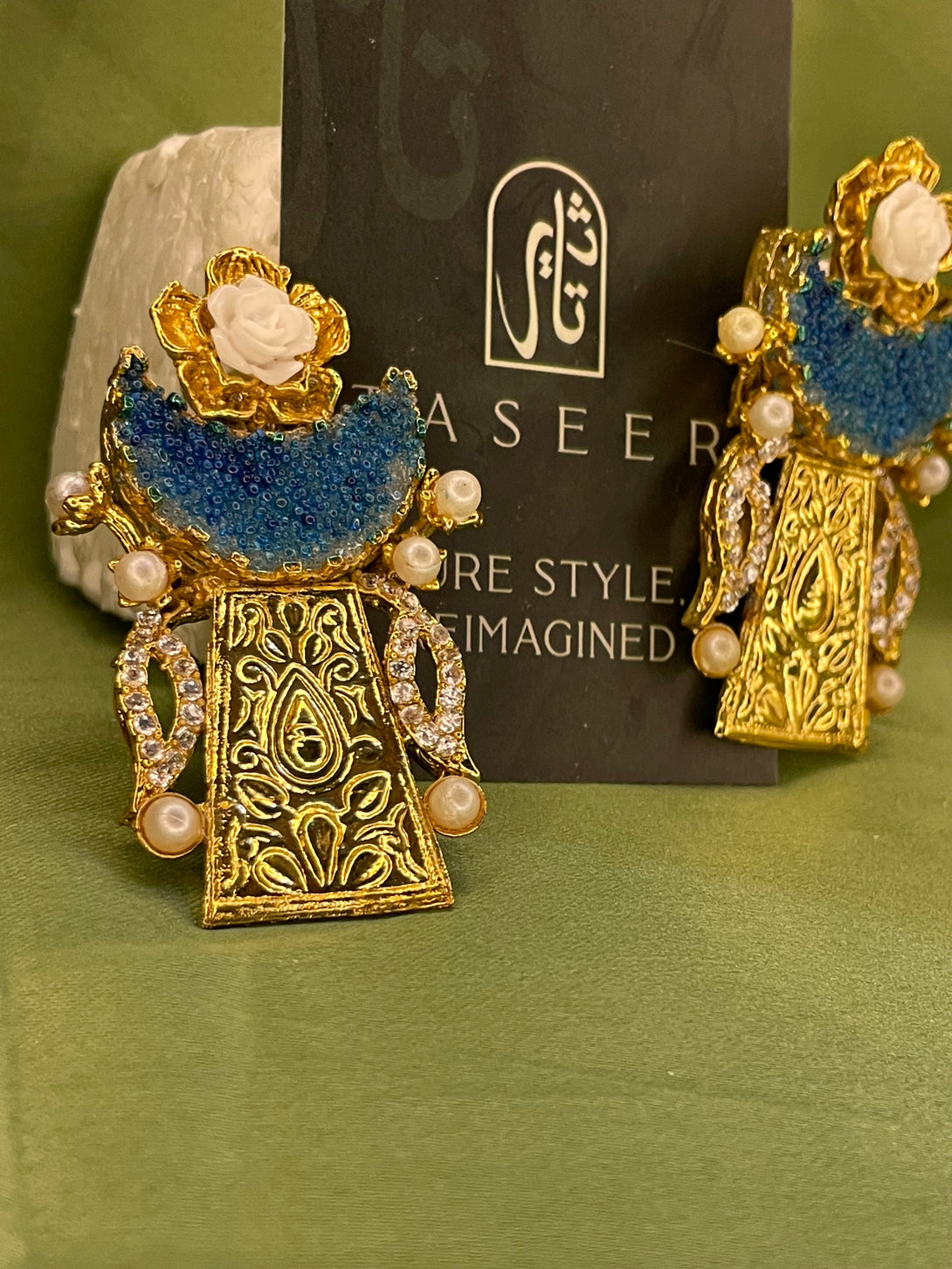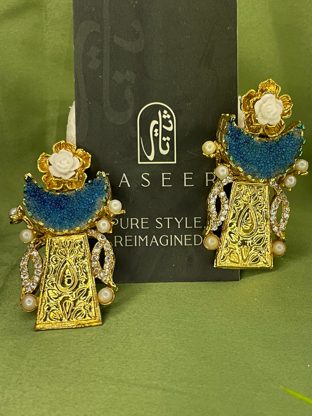 Add a touch of timeless sophistication with the Moon Crushed Stones - Egyptian Style Earrings by Taseer. Inspired by ancient Egyptian aesthetics, these handcrafted earrings feature a unique blend of Cyber Grape Crushed Stones and intricate golden detailing. The crescent moon design, accented with pearls and a delicately carved floral motif, exudes elegance and mystique. Perfect for formal occasions or adding a statement to your daily attire, these earrings are a true work of art for jewelry enthusiasts.