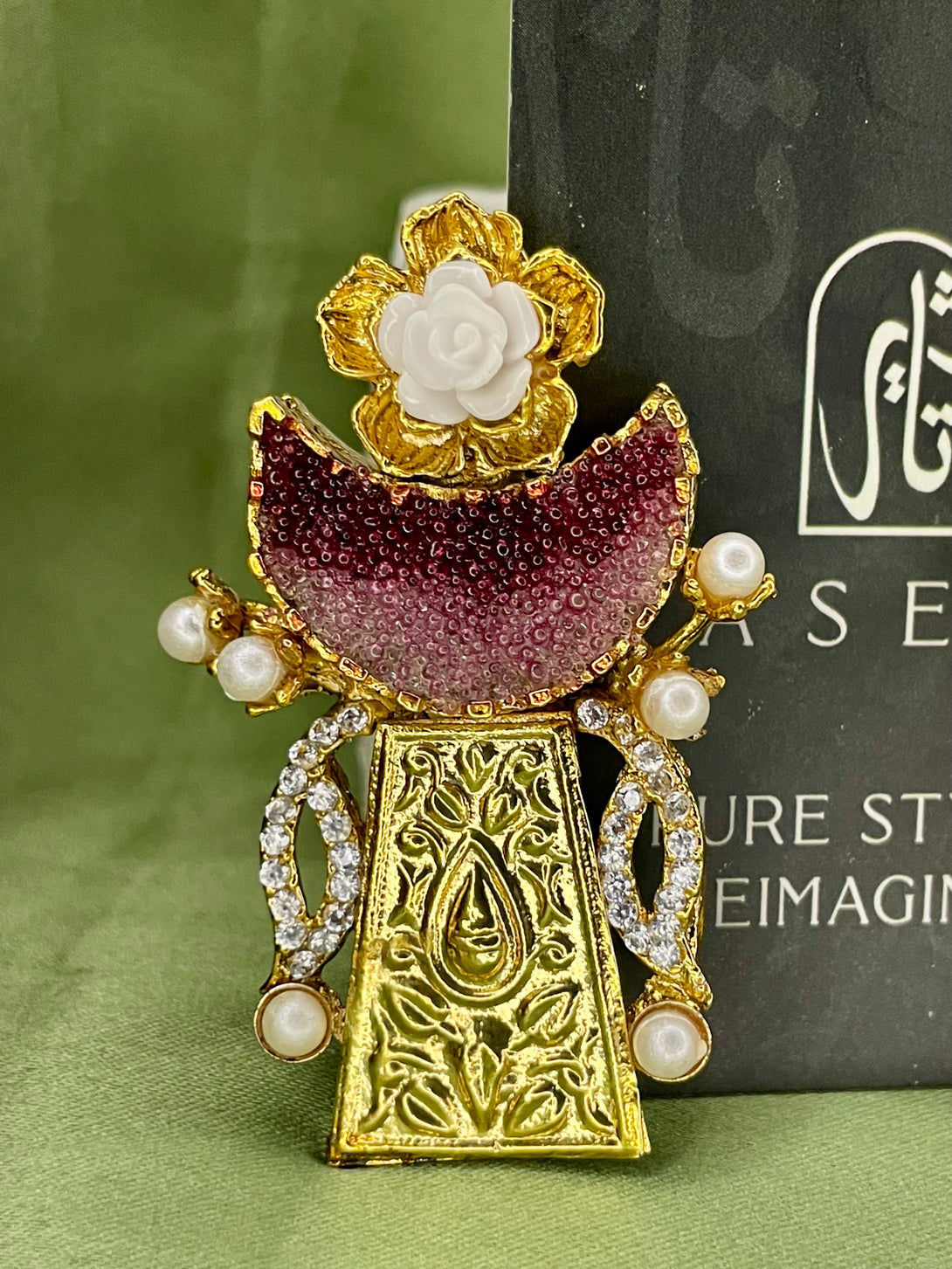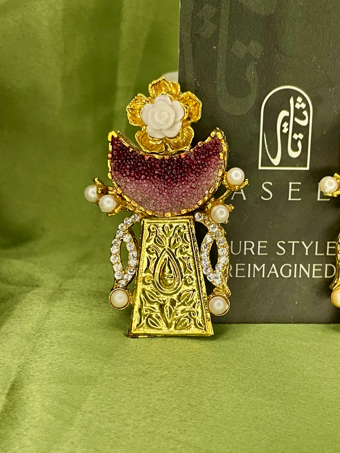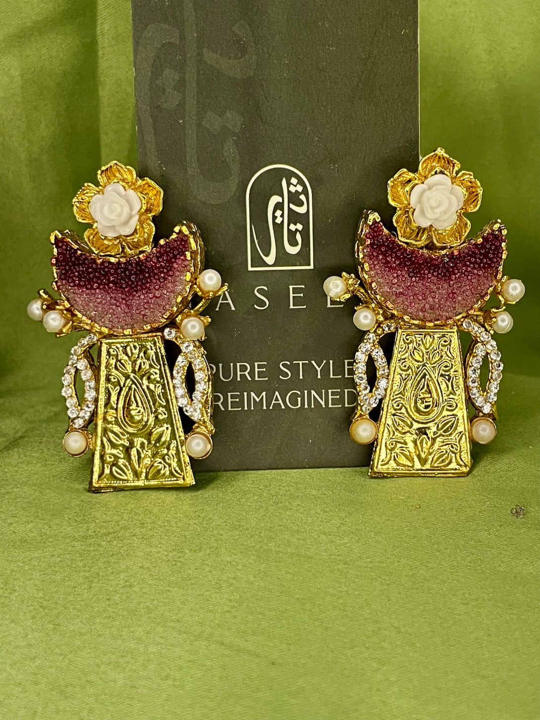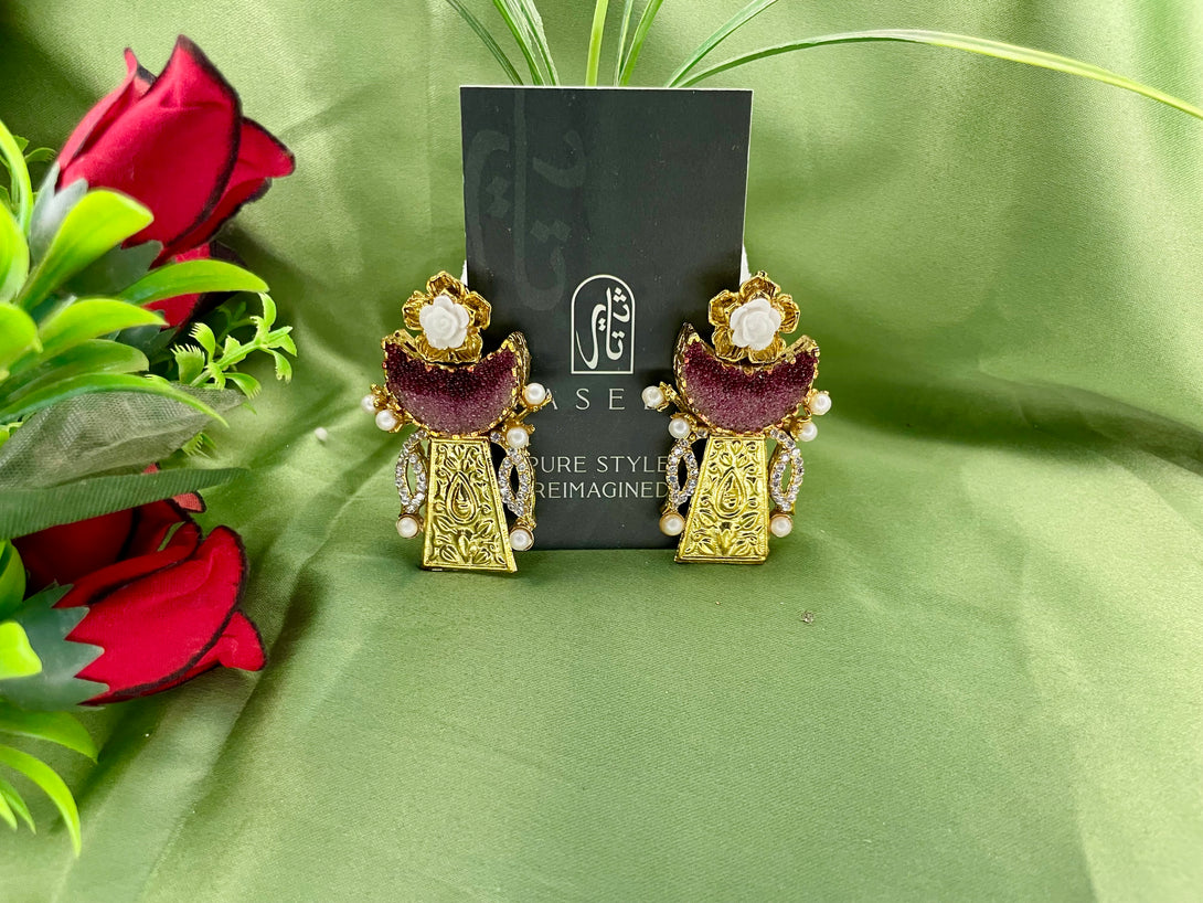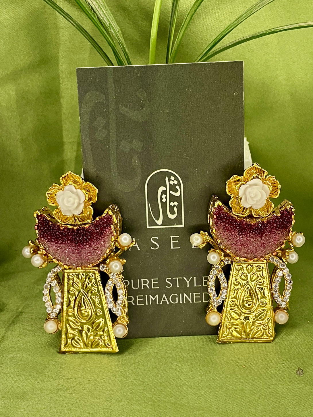 Add a touch of timeless sophistication with the Moon Crushed Stones - Egyptian Style Earrings by Taseer. Inspired by ancient Egyptian aesthetics, these handcrafted earrings feature a unique blend of Cyber Grape Crushed Stones and intricate golden detailing. The crescent moon design, accented with pearls and a delicately carved floral motif, exudes elegance and mystique. Perfect for formal occasions or adding a statement to your daily attire, these earrings are a true work of art for jewelry enthusiasts.