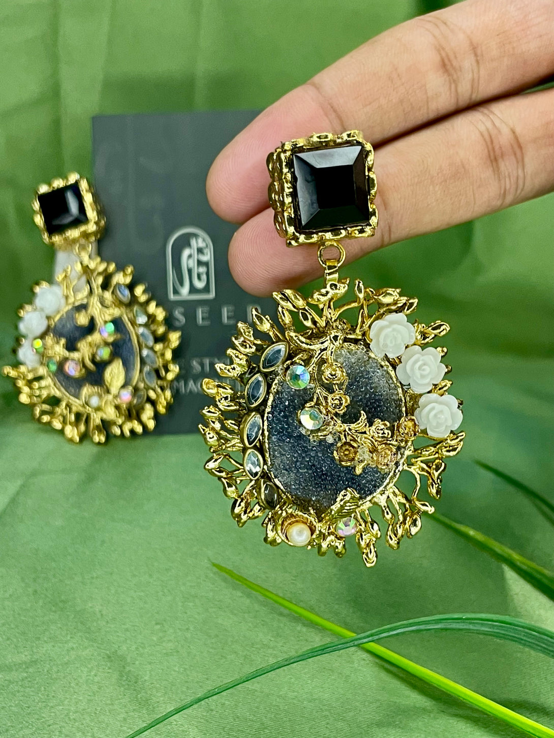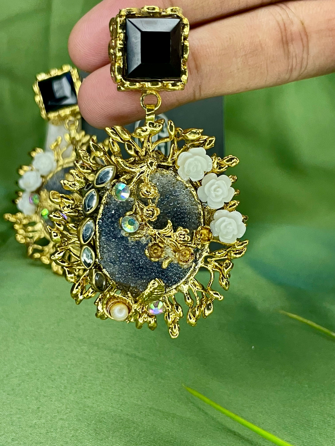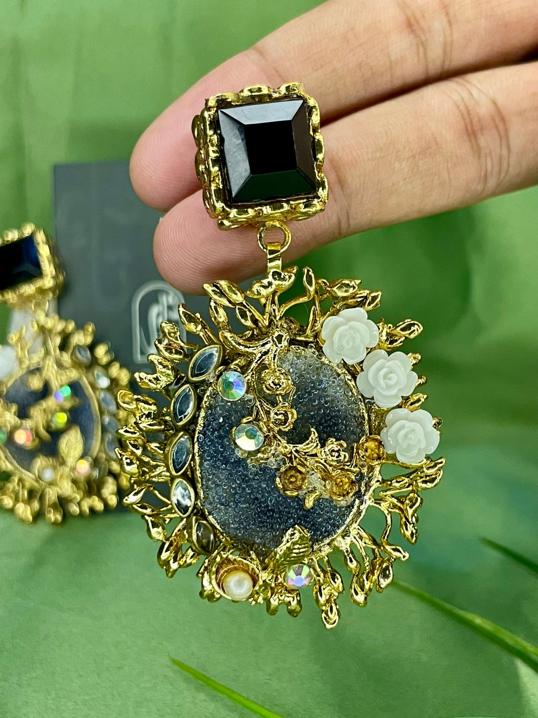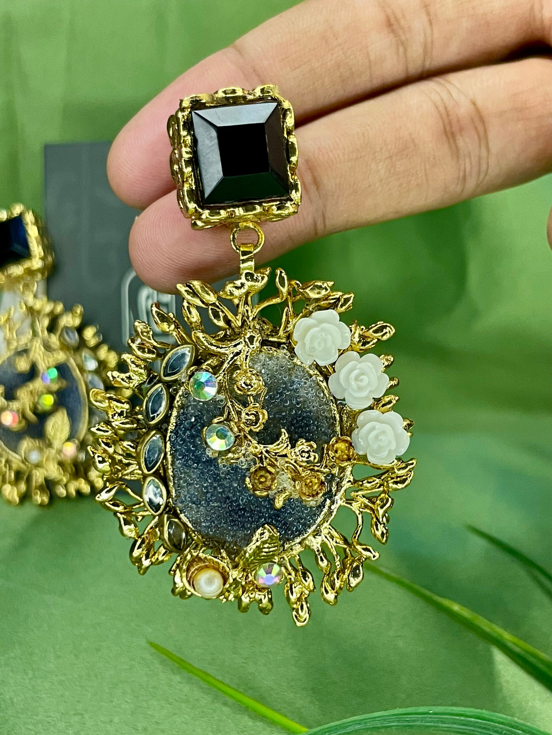 Elevate your jewelry collection with the Handcrafted Royal Gulab Studs, a perfect blend of traditional charm and modern sophistication. These exquisite earrings are adorned with intricate floral motifs, delicate pearl accents, and shimmering stones that radiate elegance. The bold black square top contrasts beautifully with the golden floral detailing, making these studs an eye-catching accessory for any special occasion.
