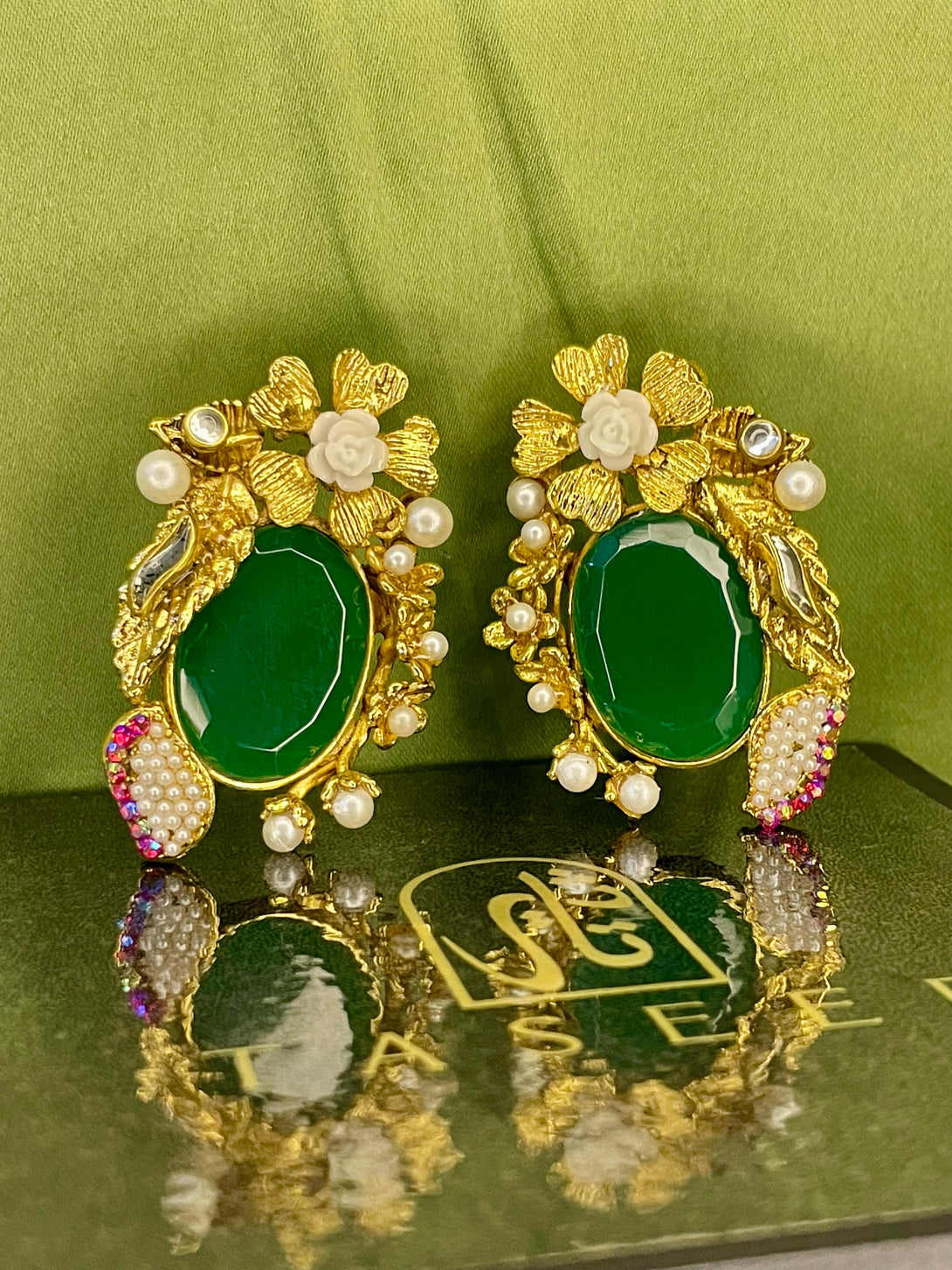 Elevate your elegance with the Handcrafted Earrings - Turkish Stones Oval Floral Studs by Taseer. These striking earrings feature a mesmerizing oval Turkish stone as the centerpiece, surrounded by delicate floral motifs, shimmering pearls, and artistic embellishments. The intricate design blends vintage charm with a modern aesthetic, making these studs a standout addition to any jewelry collection. Perfect for evening soirées, festive occasions, or simply adding a touch of glamour to your everyday look.