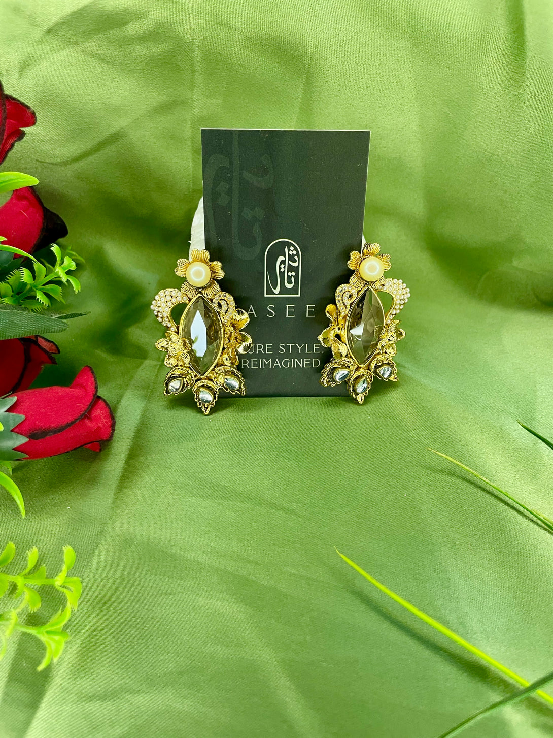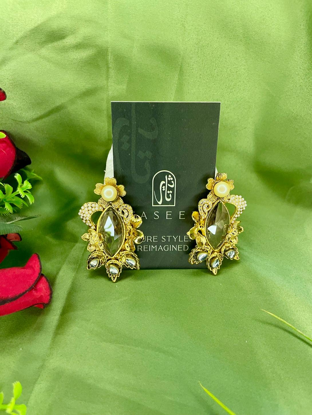 Discover the charm of Turkish artistry with the Handcrafted Turkish Double Stone Floral Earrings by Taseer. These exquisite earrings feature a captivating floral design adorned with two stunning stones and a delicate pearl at the top, creating a perfect balance of elegance and sophistication. The traditional craftsmanship shines through in every detail, making these earrings the ideal choice for adding a touch of timeless beauty to any outfit, whether for a special occasion or daily wear.