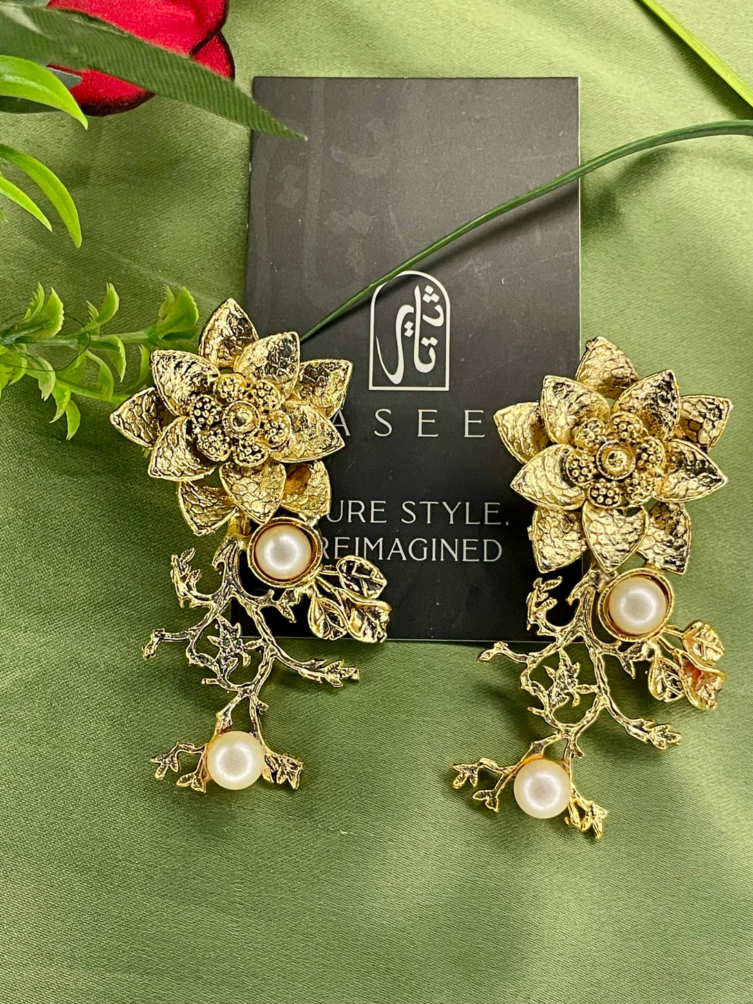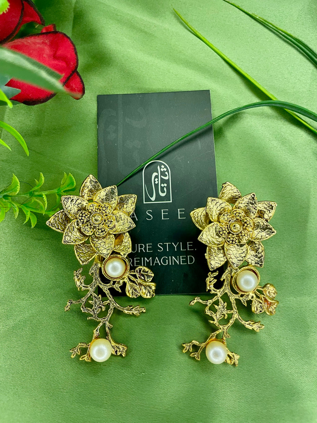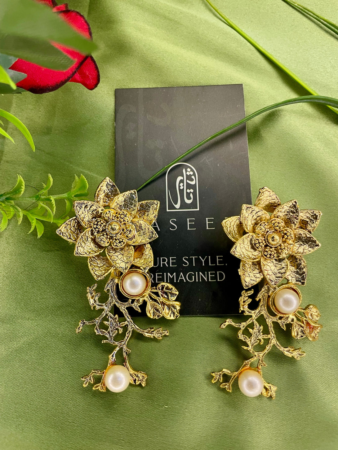 Embrace timeless elegance with the Floral Pearl Handcrafted Earrings by Taseer. These beautifully designed earrings feature delicate floral motifs embellished with lustrous pearls, creating a look that is both classic and sophisticated. Perfect for weddings, special occasions, or adding a touch of elegance to your everyday style, these earrings are crafted to make a lasting impression.