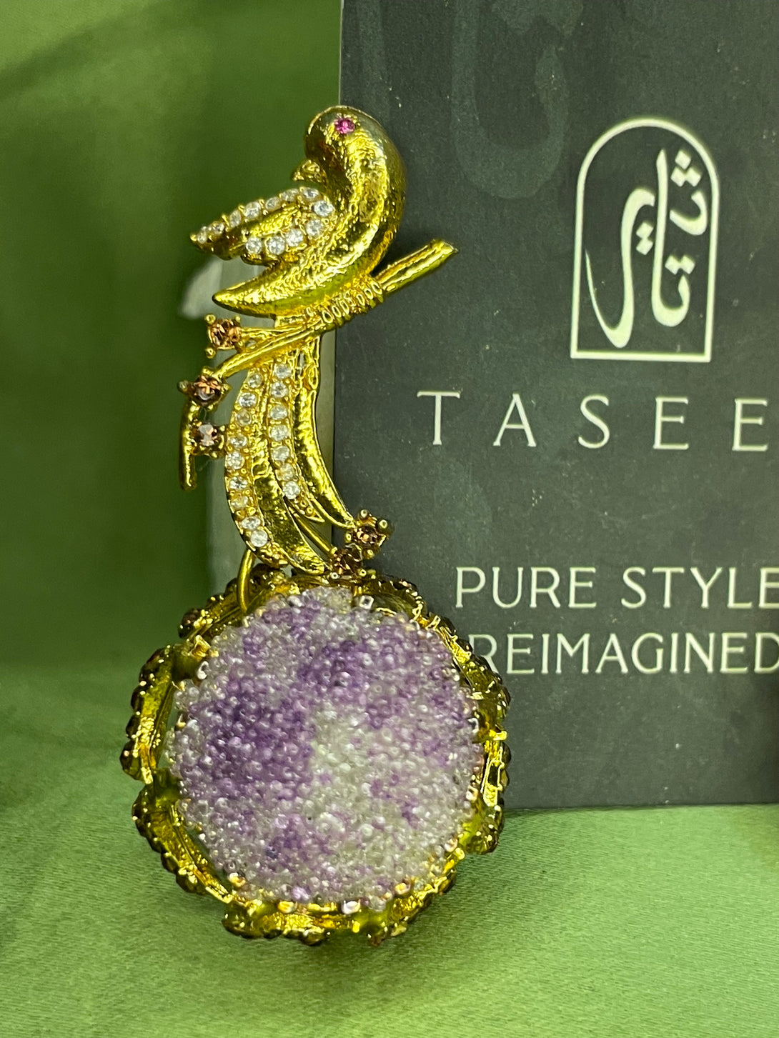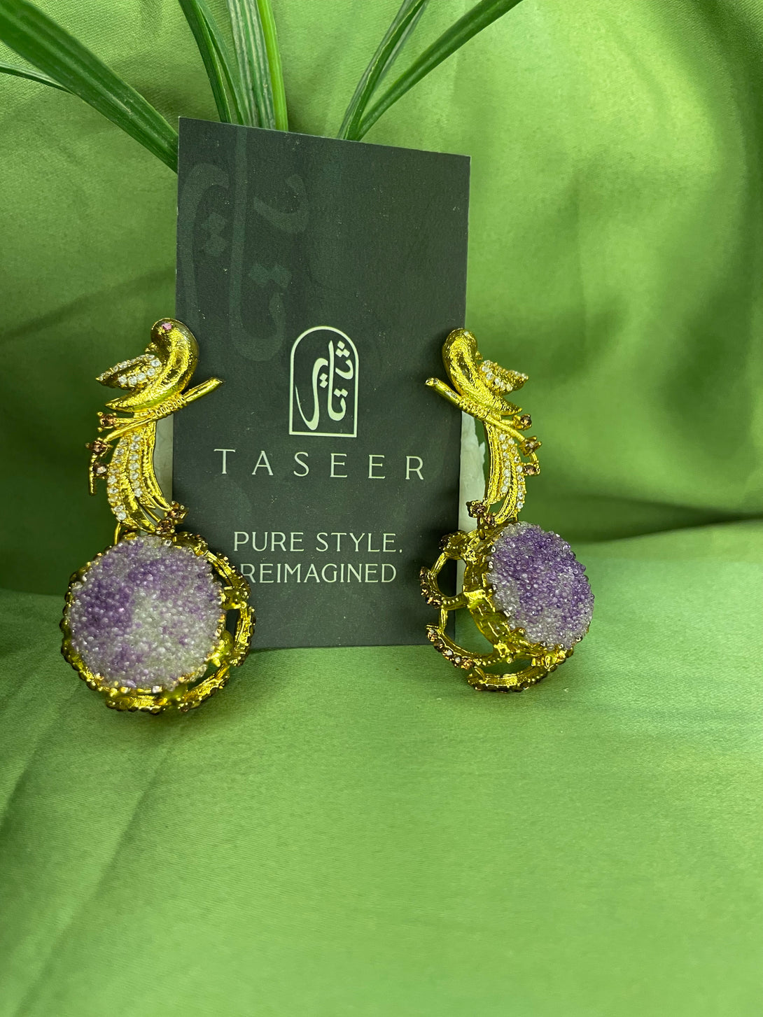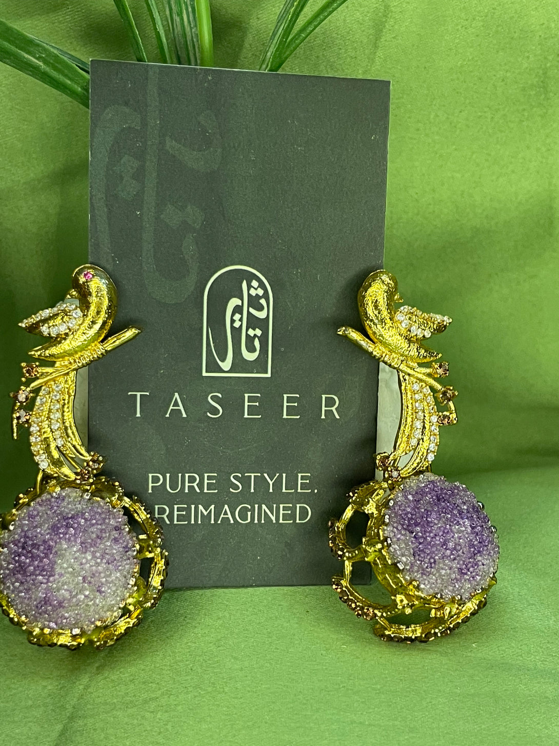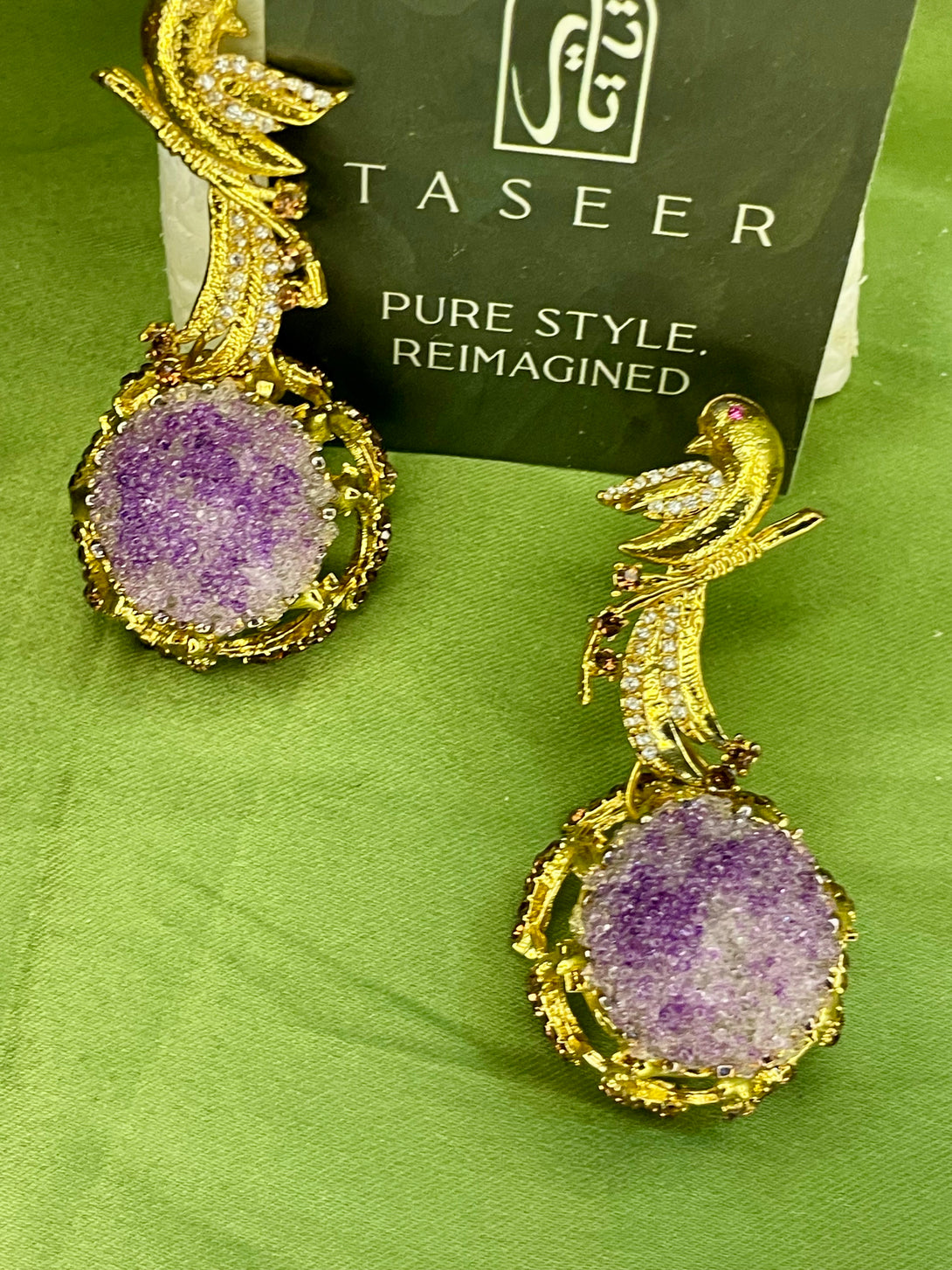 Handcrafted Parrot Crushed Stones Long Earrings in Pruple by Taseer